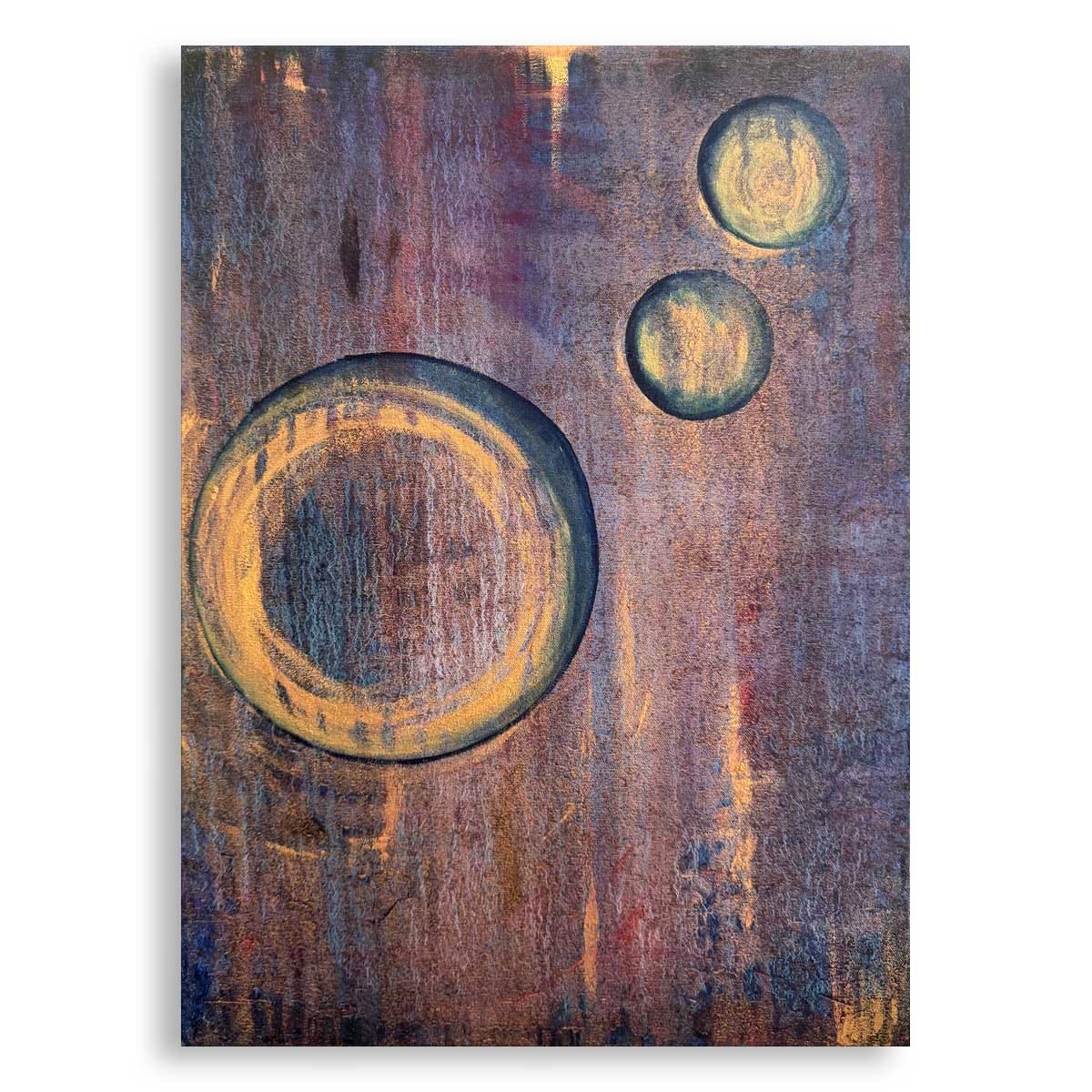 Maalauksissani usein toistuvat ympyrät. Tällä kertaa ne eivät ole vain palloja tai pelkkiä muotoja. Ne ovat kappaleita – ajatuksen sirpaleita, ilmaa, liikettä. Kankaalla leijuu kevyitä, pehmeäreunaisia ympyröitä. Jokainen hieman erilainen: jokin on samea ja utuinen, toinen kirkas ja tarkkarajainen. Värit liukuvat toisiinsa sinisestä kullanhohteeseen ja lähes näkymättömään valkoiseen. Kuplat eivät ole järjestyksessä, mutta niissä on rytmi, kuin hengitys tai musiikki. Ne kelluvat, mutta eivät eksy.