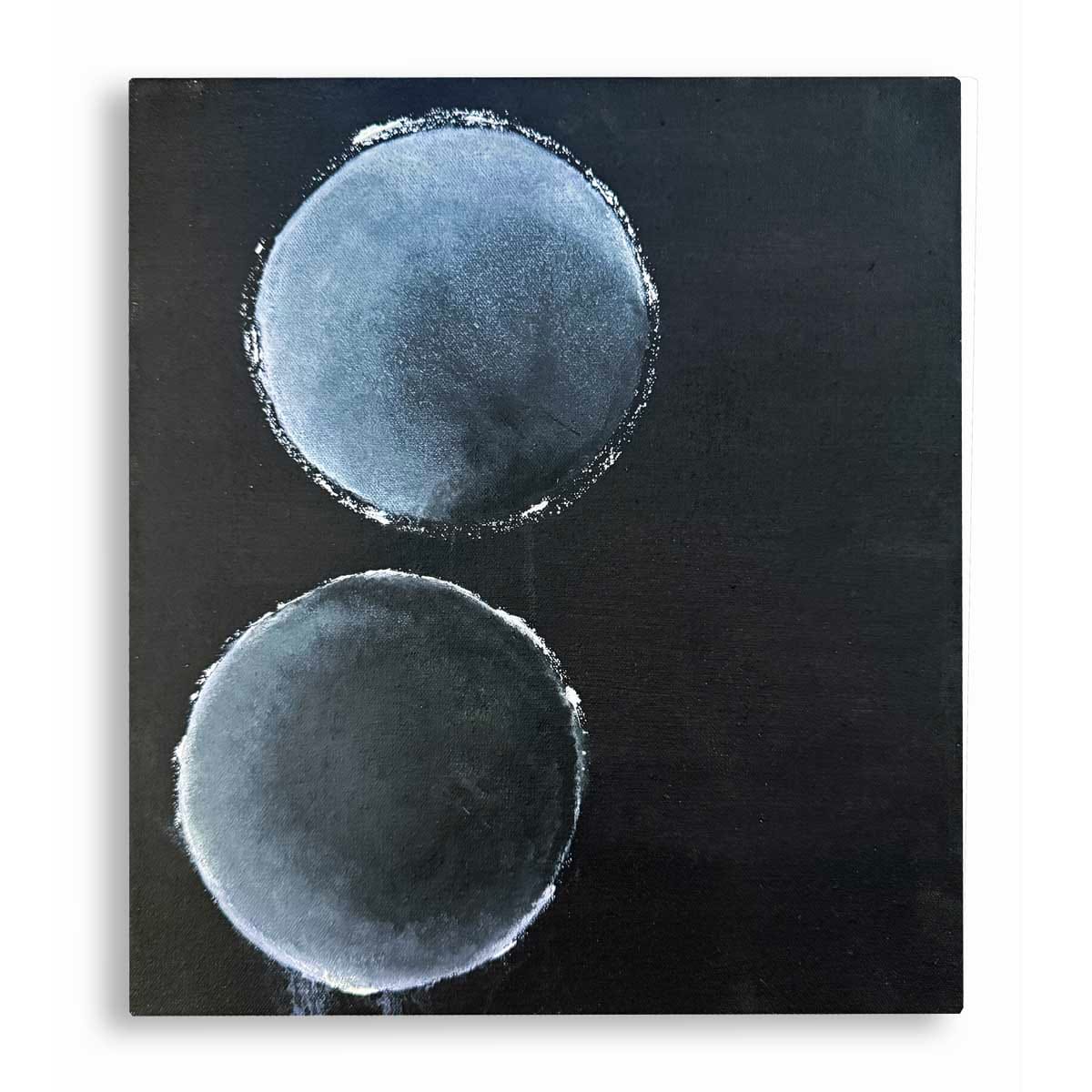 Ympyrä on muoto, joka palaa luokseni yhä uudelleen. Se on alku ja loppu samassa vedossa. Tuttu, yksinkertainen ja silti loputtoman syvä, täynnä mahdollisuuksia. Tässä maalauksessa ympyrä ei ole kevyt eikä leijuva. Se on raskas. Se on kivi. Maalasin valkoiset ympyrät mustalle pohjalle, koska halusin nähdä, miten valo syntyy pimeästä – ei ulkoisesta hohteesta, vaan muodon sisäisestä hiljaisuudesta. Ympyrät ovat osa maata, osa aikaa. Ne ovat kuin kivet: painavia, isoja mutta kauniita, vailla kiirettä, vailla tarvetta selittää itseään.
